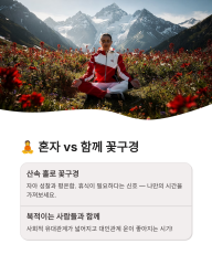 만약 아주 평화롭고 고요한 산속에서 홀로 꽃구경을 즐겼다면 이는 자아 성찰과 평온한 마음을 뜻해요. 복잡한 현실에서 벗어나 휴식이 필요하다는 신호일 수도 있으니 나만의 시간을 가져보는 것을 추천드려요. 반대로 북적이는 사람들 틈에서 신나게 꽃구경을 했다면 사회적인 유대관계가 넓어지고 대인관계 운이 좋아지는 시기입니다. 어떤 상황이었든 꽃이 주는 긍정적인 에너지는 여러분의 삶에 활력을 불어넣어 줄 거예요!