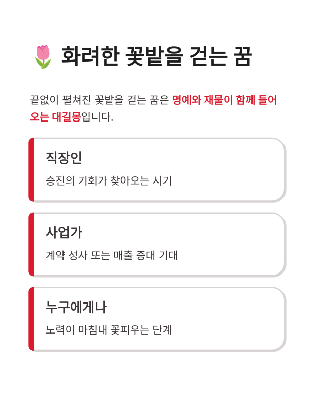 끝없이 펼쳐진 화려한 꽃밭을 걷는 꿈은 명예와 재물이 함께 들어오는 대길몽으로 풀이됩니다. 직장인이라면 승진을, 사업가라면 계약 성사나 매출 증대를 기대해 볼 수 있는 시기죠. 내가 노력해 온 일들이 마침내 꽃을 피우고 열매를 맺는 단계에 접어들었다는 것을 무의식이 알려주는 거예요.