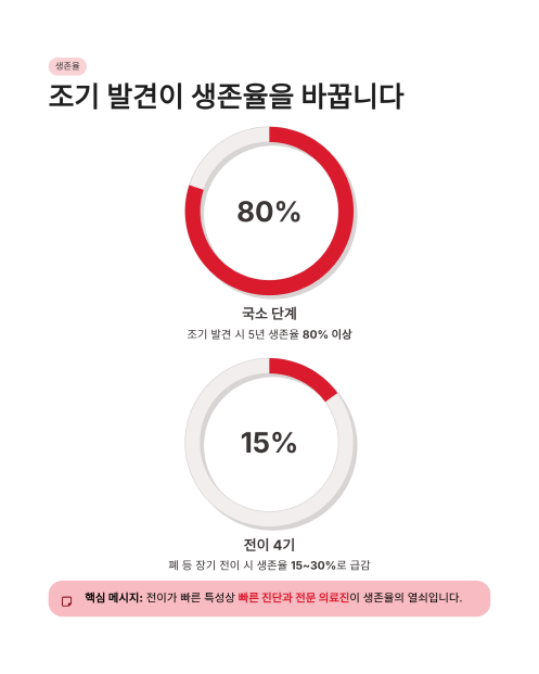 - 조기 발견 시 생존율은 80% 이상으로 높지만, 전이 시 급격히 낮아지므로 빠른 진단이 필수입니다.
