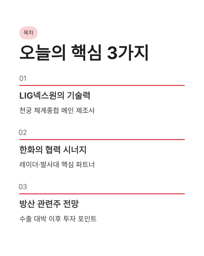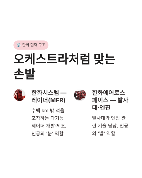 2. 한화시스템/한화에어로스페이스: 각각 레이더와 발사대 등 핵심 하드웨어를 공급하는 필수 파트너입니다.