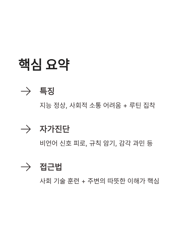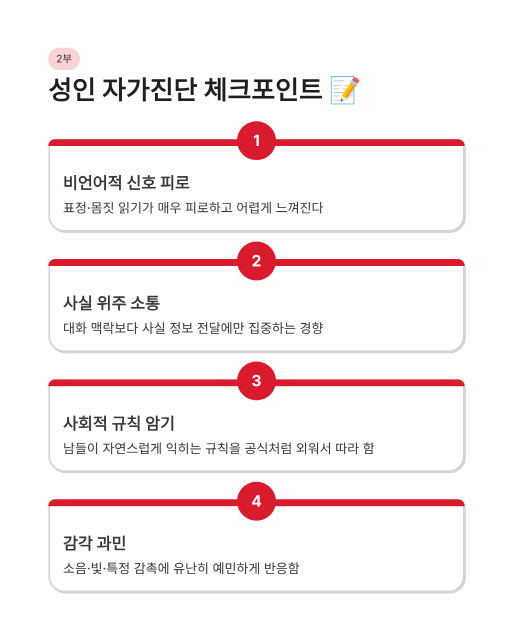 - 성인의 경우 눈치 없음, 사회적 신호 무시, 감각 예민 등을 통해 자가진단해 볼 수 있습니다.