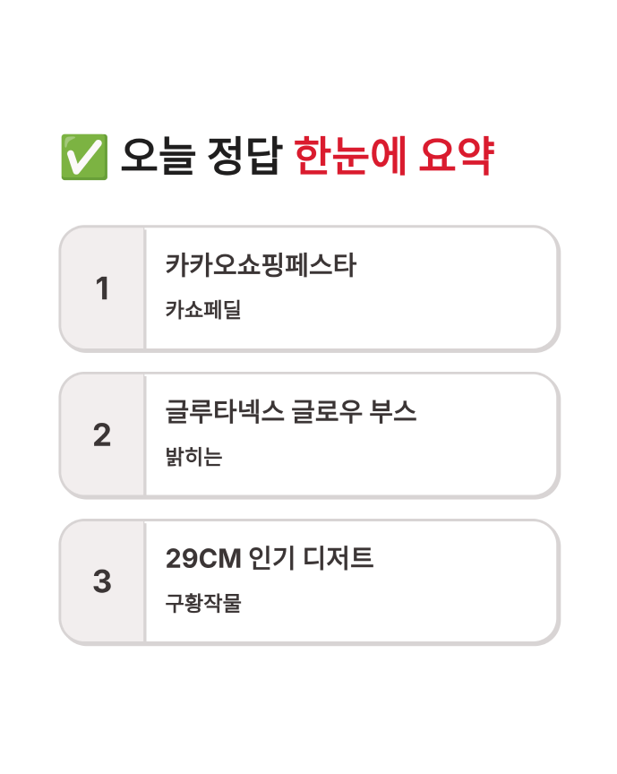 우선 카카오쇼핑페스타(카쇼페) 시작과 관련된 문제의 정답은 카쇼페딜입니다! 카카오톡에서 쇼핑할 때 이런 페스타 기간을 잘 이용하면 득템할 게 정말 많더라고요. 그리고 글루타넥스 글로우 부스 관련 문제의 정답은 밝히는입니다. 피부를 환하게 밝혀준다는 의미를 담고 있는 것 같아요.