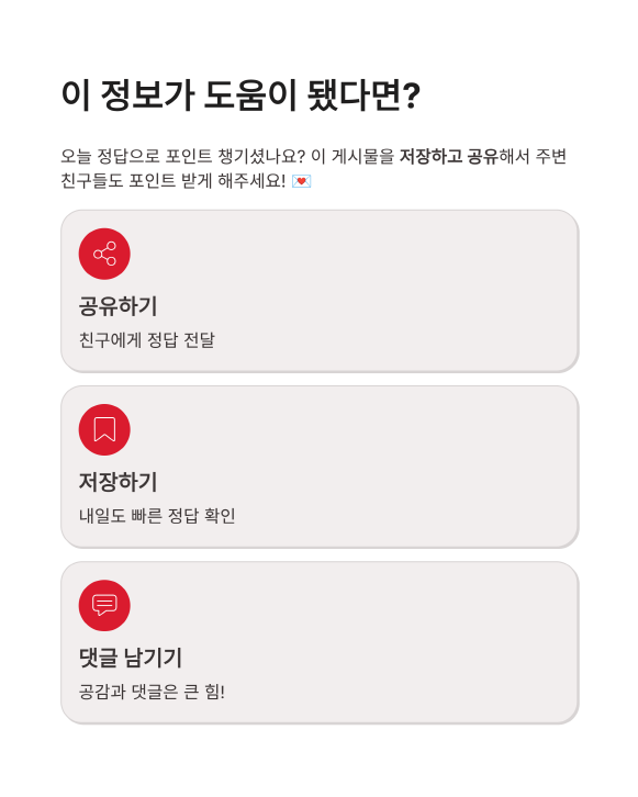 정답이 바뀌거나 새로운 퀴즈가 올라오면 가장 빠르게 업데이트해 드릴게요. 공감과 댓글은 저에게 큰 힘이 됩니다!