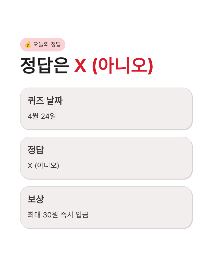 안녕하세요! 매일 아침 간단한 퀴즈 하나로 기분 좋게 현금을 챙기는 카카오뱅크 앱테크 시간이 돌아왔습니다. 오늘 4월 24일 퀴즈는 법률 상식과 관련된 문제였는데요. 정답은 바로 X (아니오)입니다!