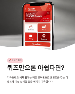 퀴즈 하나만 풀고 끝내기엔 조금 아쉽죠? 카카오뱅크 앱 안에는 퀴즈 외에도 소소하게 돈을 벌 수 있는 메뉴들이 참 많습니다. 혜택 탭에 들어가 보시면 단순히 버튼만 눌러도 포인트를 주는 이벤트부터, 다양한 미션에 참여하고 현금을 바로 받을 수 있는 코너들이 숨어 있어요.