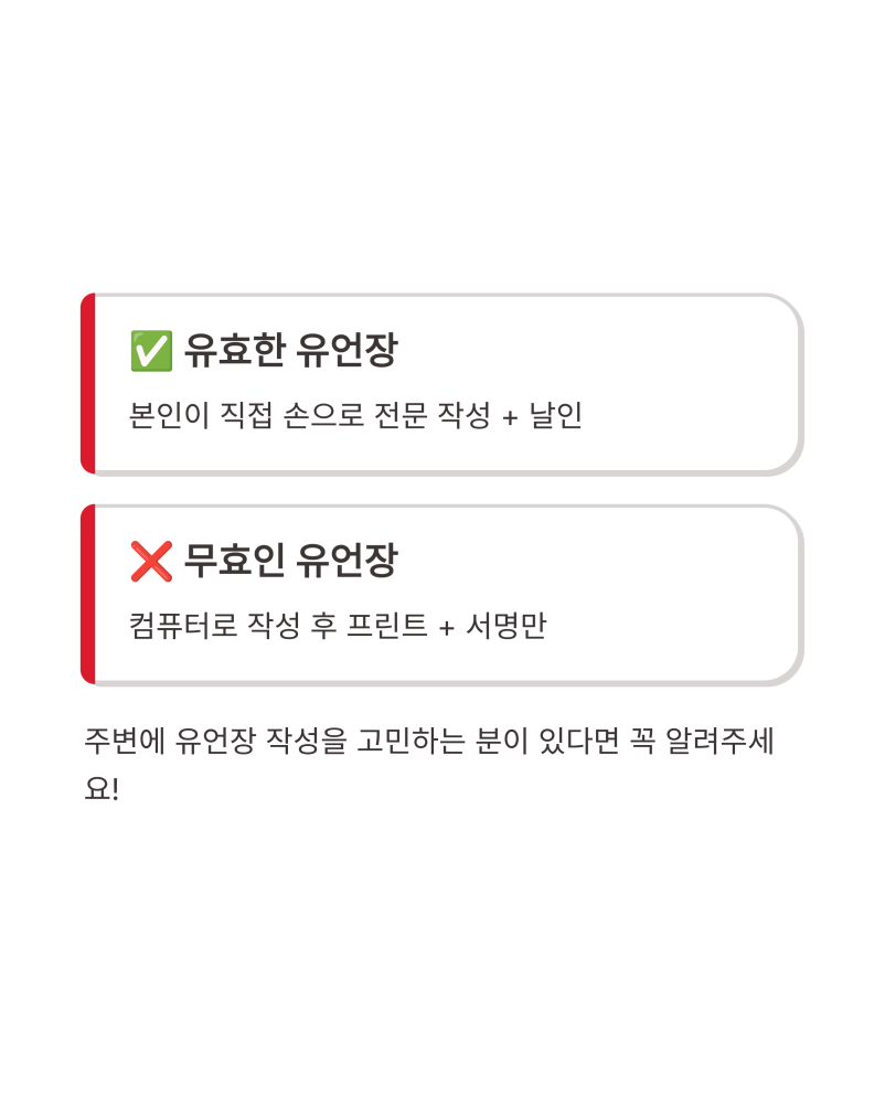 - 핵심 포인트: 유언장은 반드시 자필로 작성해야 법적 효력이 인정됩니다.