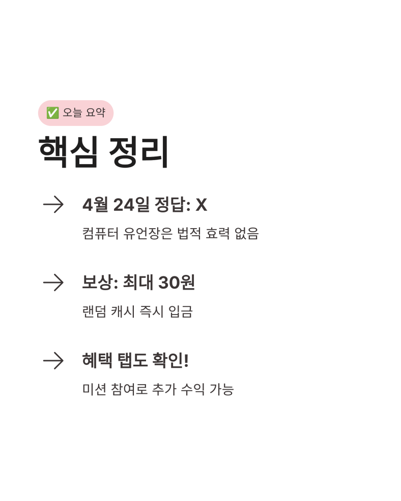 4월 24일 카카오뱅크 OX퀴즈정답 공개! 유언장 효력 상식 앱테크로 현금 쌓기