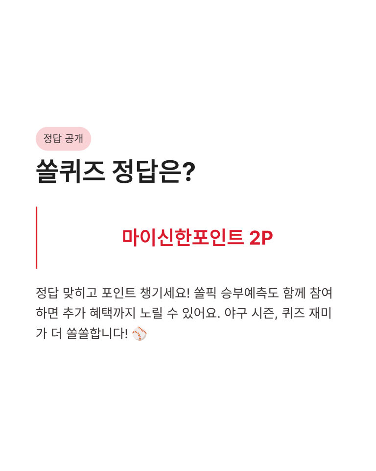 정답 맞히시고 포인트 꼭 챙기시고요! 쏠픽 승부예측도 잊지 말고 참여해서 추가 혜택 노려보세요. 야구 시즌이라 그런지 퀴즈 푸는 재미가 더 쏠쏠한 것 같아요.