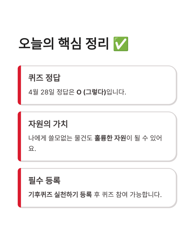 4월 28일 경기도 기후행동 기회소득 퀴즈 정답을 찾고 계신가요? 버려지는 자원의 가치를 일깨워주는 오늘의 문제와 정답을 확인하고 기분 좋게 포인트까지 챙겨보세요!