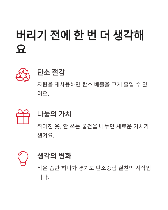 이렇게 자원을 다시 사용하는 것만으로도 탄소 배출을 줄이는 데 큰 역할을 할 수 있습니다. 퀴즈에서 언급한 것처럼 나에게는 수명이 다한 물건이라도 누군가에게는 새로운 가치가 될 수 있다는 점, 꼭 기억하면서 버리기 전에 한 번 더 고민해보는 습관을 가지면 좋을 것 같아요. 경기도 기후행동 기회소득은 바로 이런 작은 생각의 변화를 응원하는 정책이랍니다.