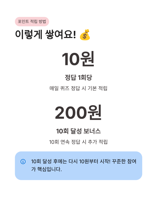 포인트는 정답을 맞힐 때마다 10원부터 차곡차곡 쌓이는데요, 10회 정답을 달성하면 보너스로 200원이 추가 적립되는 혜택까지 있답니다. 10회 달성 후에는 다시 10원부터 시작되니 꾸준히 참여하는 게 핵심이에요. 저도 매일 아침 출근길에 퀴즈를 푸는데, 한 달 동안 모인 포인트를 보면 생각보다 쏠쏠해서 기분이 참 좋더라고요. 경기도민이라면 절대 놓치지 말아야 할 혜자 앱테크입니다!